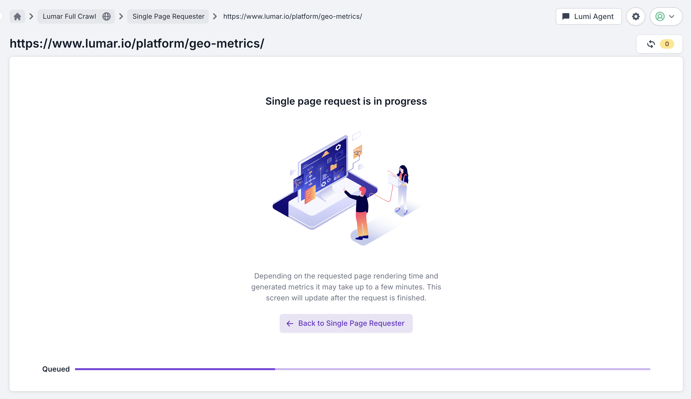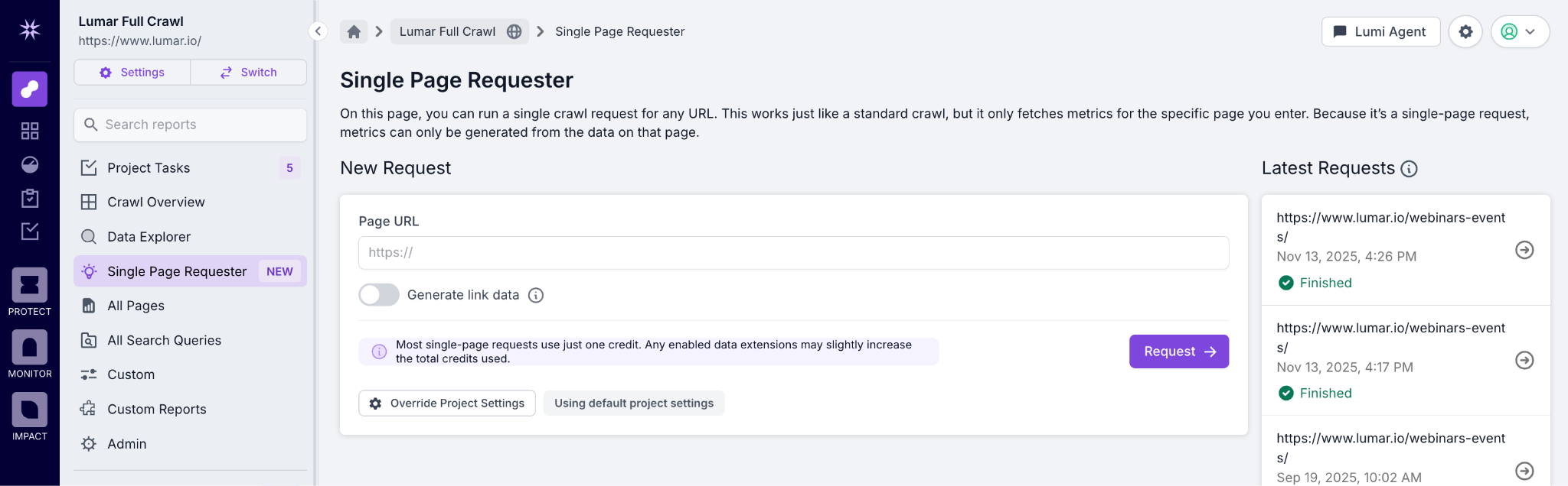 The Single Page Requester lets you run a one-off crawl for a single URL inside an existing project. It’s ideal for validating fixes, checking a recently updated page, or troubleshooting an issue without waiting for the next scheduled crawl or creating a separate project.