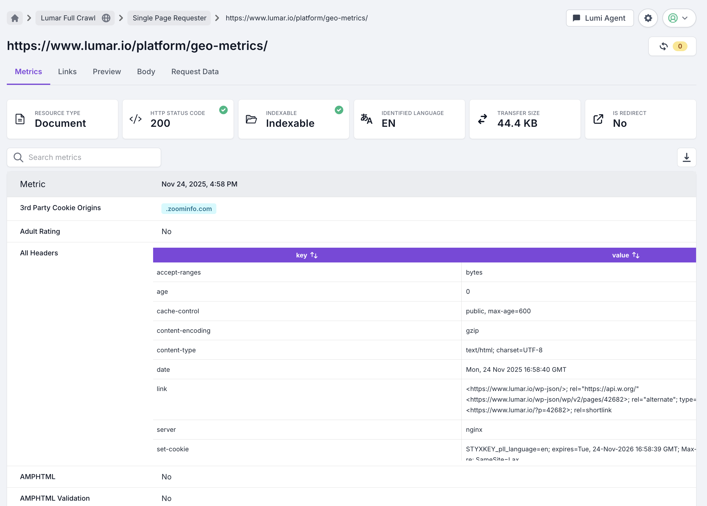 Metrics may differ slightly from those in full crawl reports, because post-crawl, aggregate metrics are not generated for single page requests.