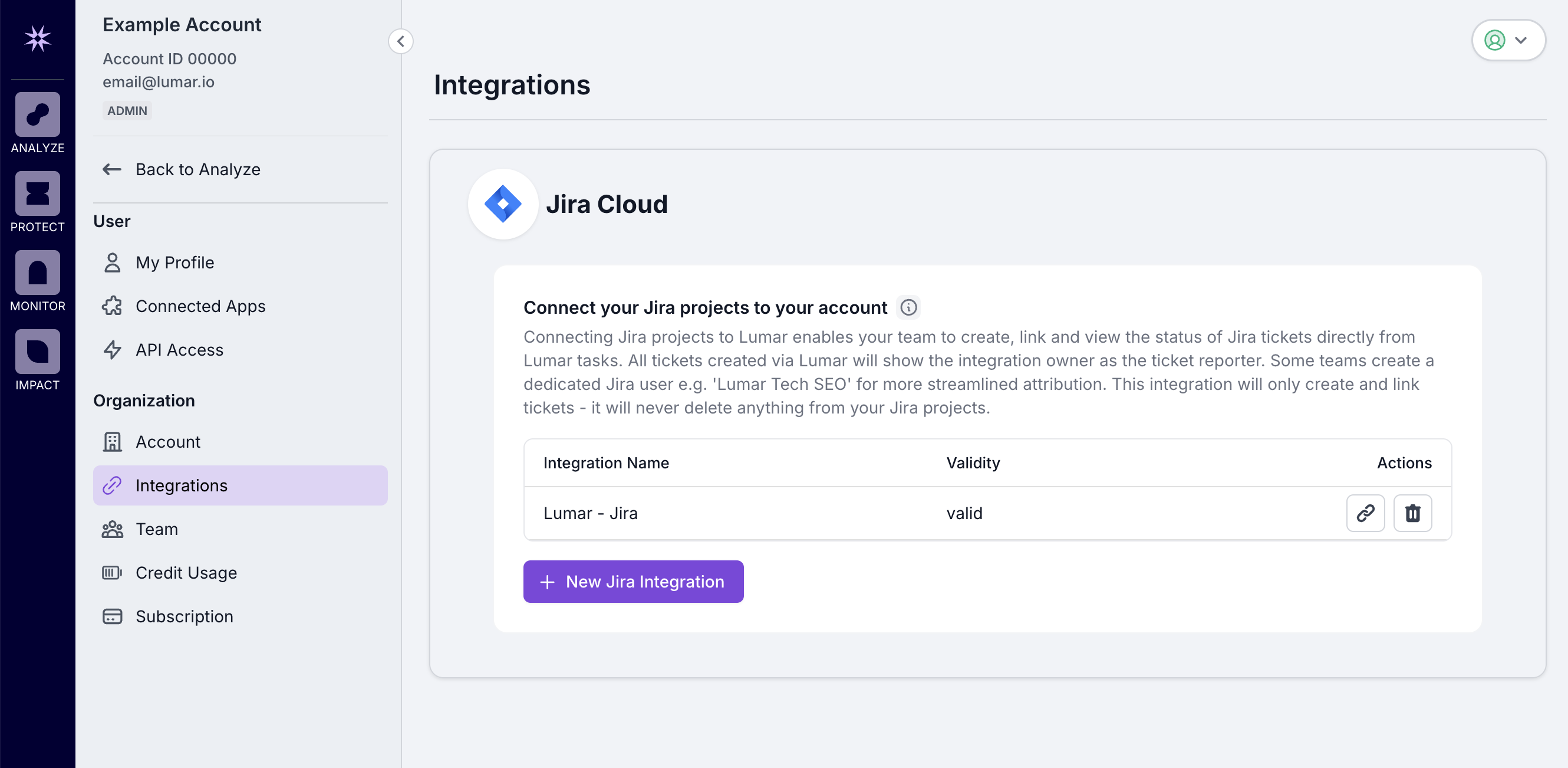 You can now integrate Lumar with Jira Cloud to create new Jira tickets or link existing ones directly from Lumar’s Task Manager. When creating a ticket, Lumar can automatically populate key task details – and you can optionally embed AI-generated ticket content for a richer, developer-ready format. Linked tickets also display their current Jira status in Lumar, so you can track progress without switching tools.