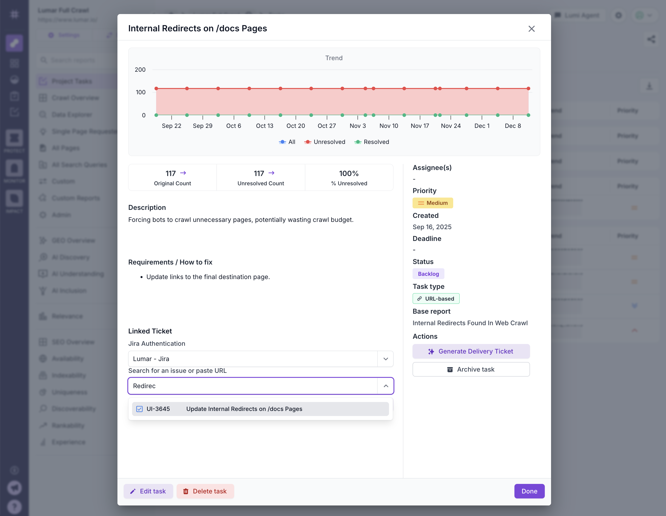 Create new Jira tickets from Lumar tasks (choosing Jira project + issue type).