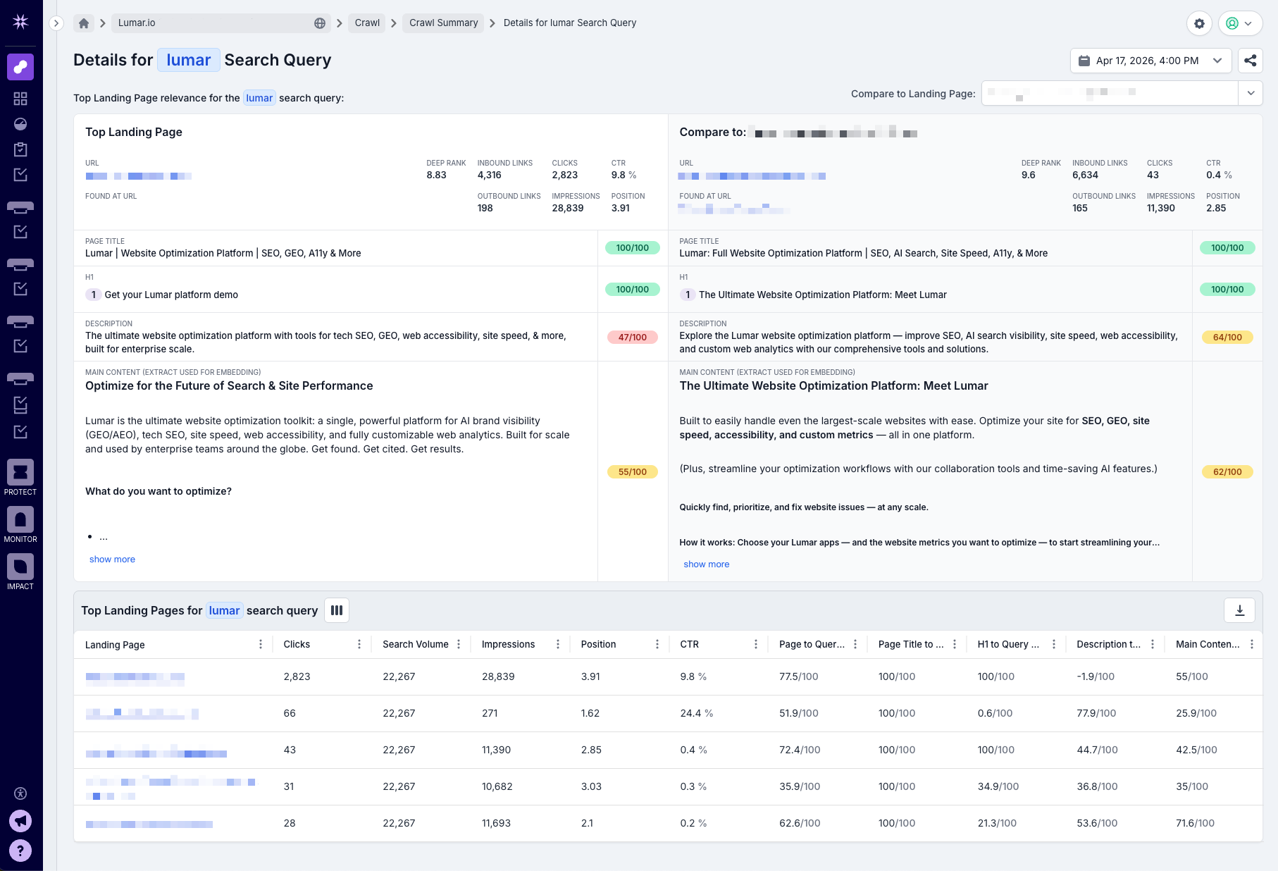 The left panel always shows the top landing page — the page Lumar has identified as the primary match for this query based on relevance and click data. The right panel shows a second page for comparison, which you can change using the Compare to Landing Page dropdown at the top right. This lets you compare your top landing page against any other page associated with the same query.