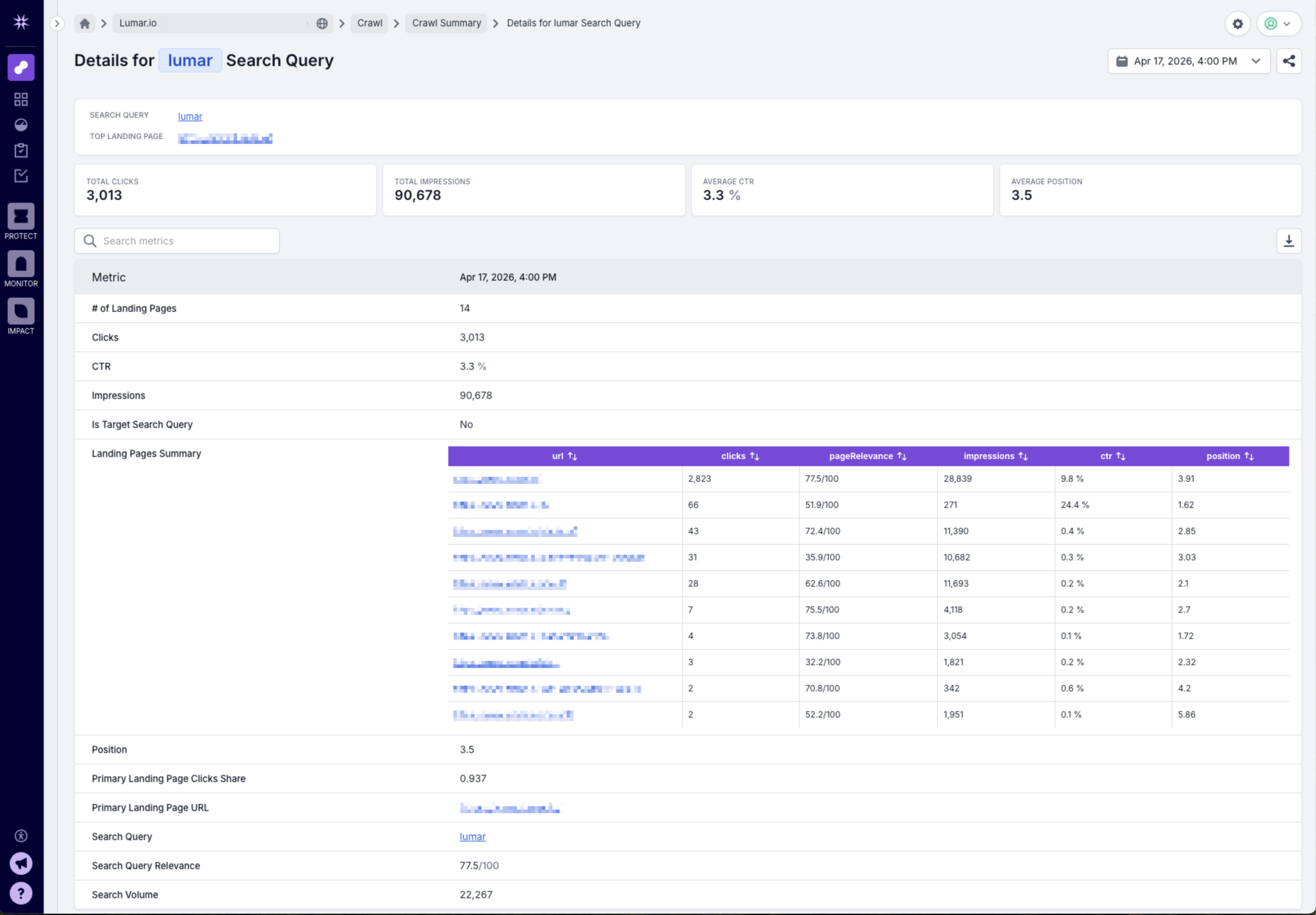 Clicking on any search query in the Relevance reports opens the query detail page. This is where you can investigate how specific pages are performing against a query, compare candidate landing pages side by side, and access AI-generated suggestions for improving page element copy.
