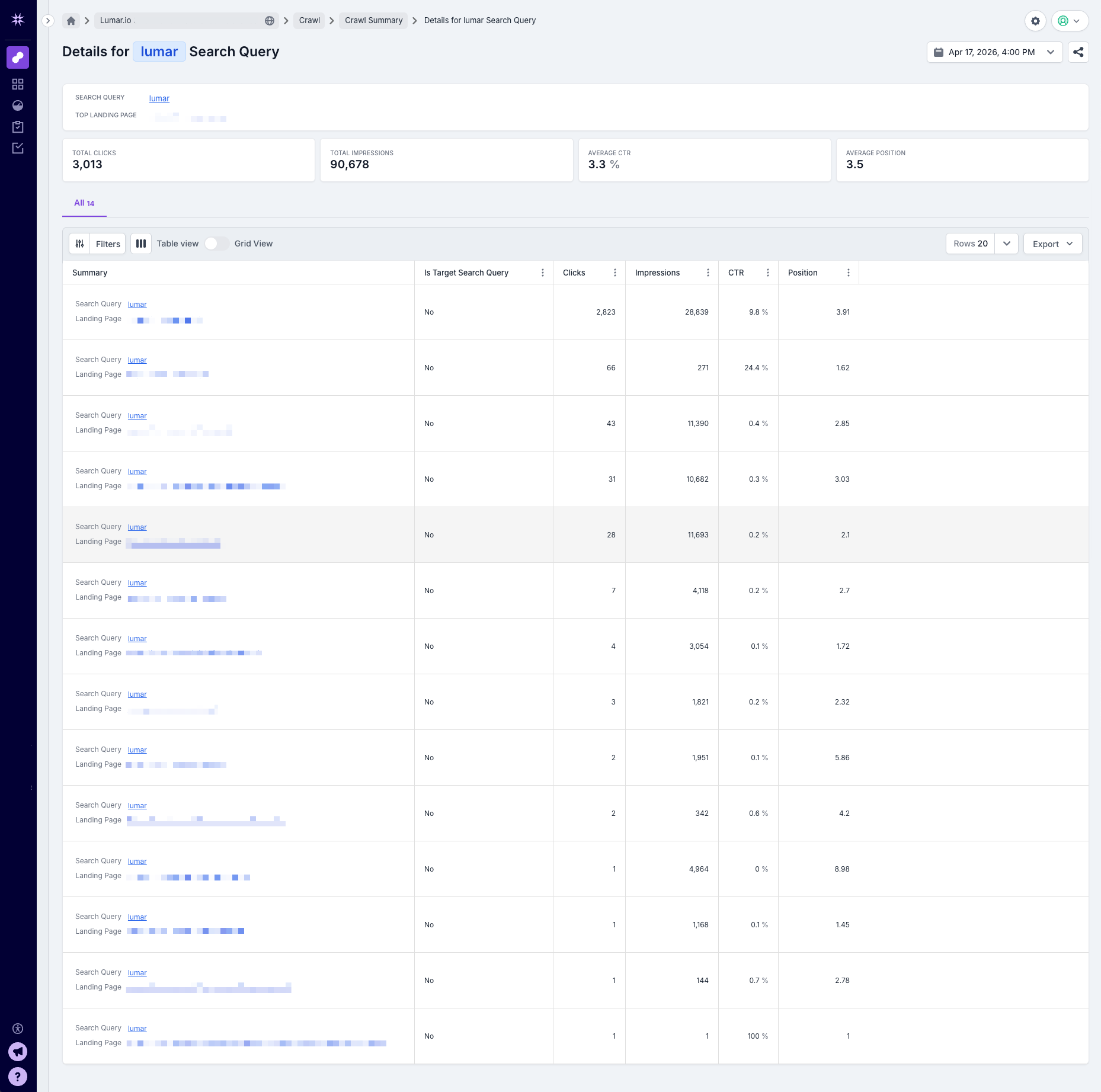 From either the Search Query Overview or the Top Landing Pages table, clicking a page URL takes you to the Resource Detail page for that URL. This is Lumar's standard page-level detail view, which includes technical data, duplicate checks, link data, and more.