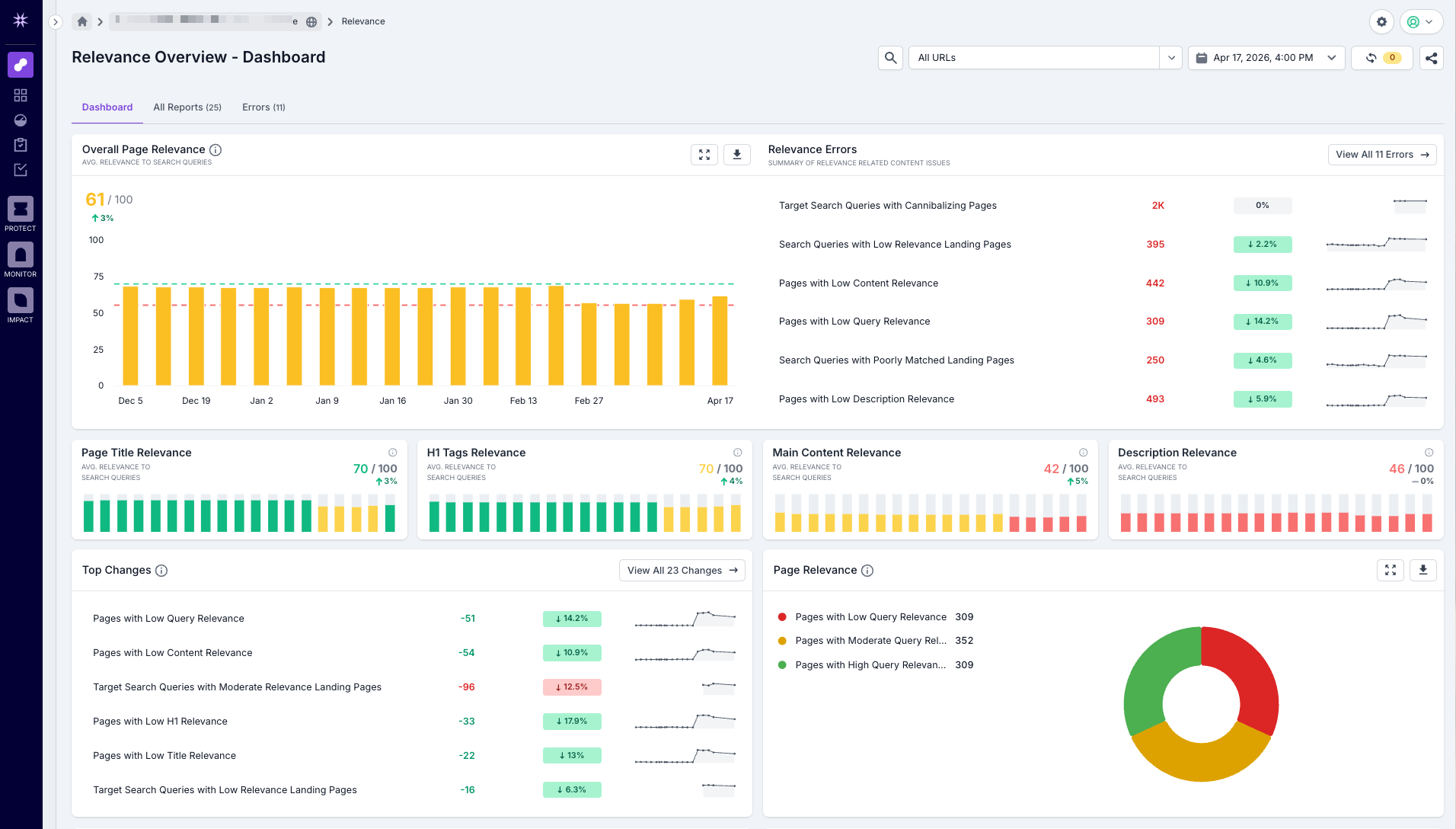 You can now score how well your page content semantically matches search queries with the new Relevance Reporting feature in Lumar Analyze. Scores are broken down by page element - title, H1, description, and main content - so you can see exactly where the alignment is strong and where it isn't. Connect your Google Search Console account to score observed queries alongside traffic data, upload target search queries to check coverage for priority terms, and use Content Suggestions to generate AI-powered alternative copy for your title, H1, and description.